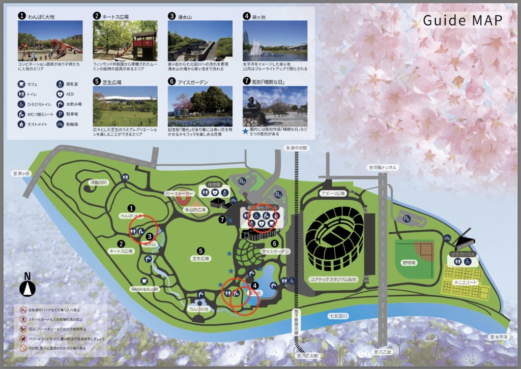 ただし、こちらの公園は芝生広場以外にも魅力あるスポットがたくさん!遊具や水遊び可能なせせらぎ、体育館、スタジアムまであるので、180台しか無い駐車場は混雑が予想されます。
