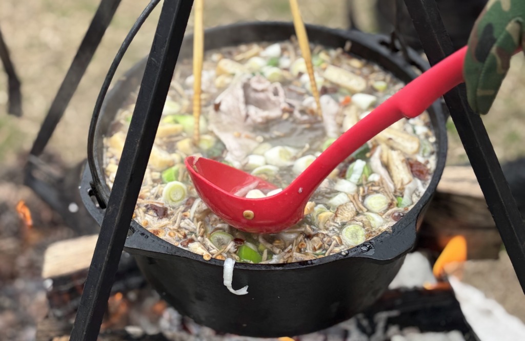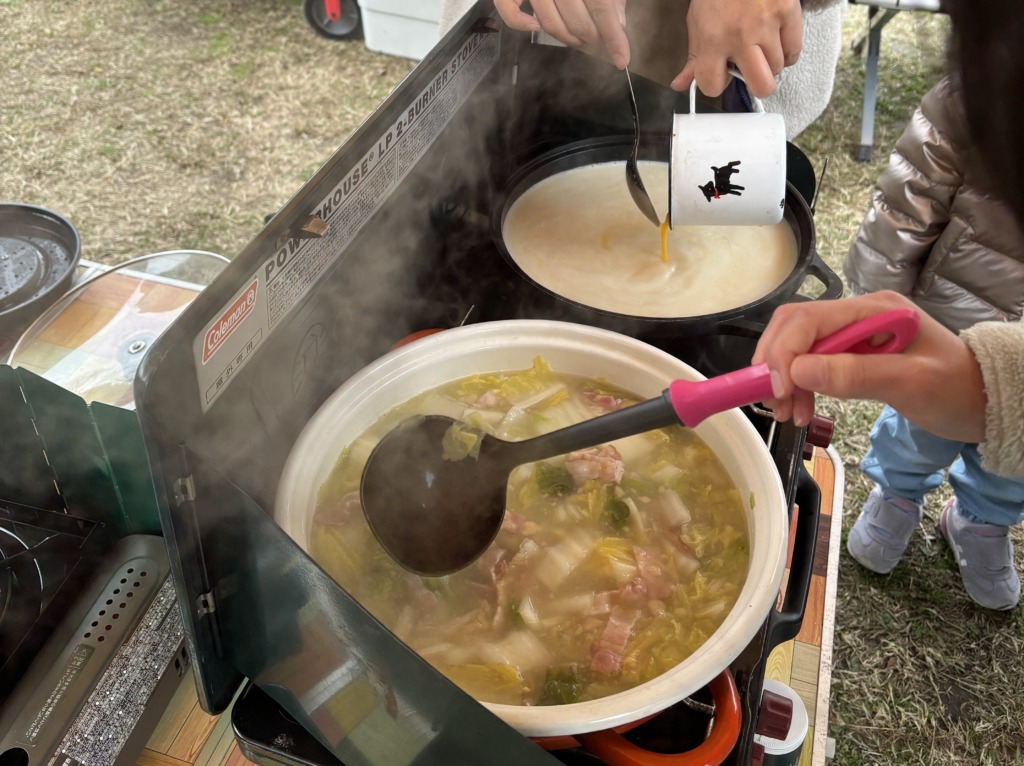 web検索的には、一般的なスープや豚汁などは1食200g程度での計算が基本とのことでしたが、「よく食べる子もいるかもしれないから…」と思い、焚き火+ツーバーナで2倍近い15Lのスープを調理。