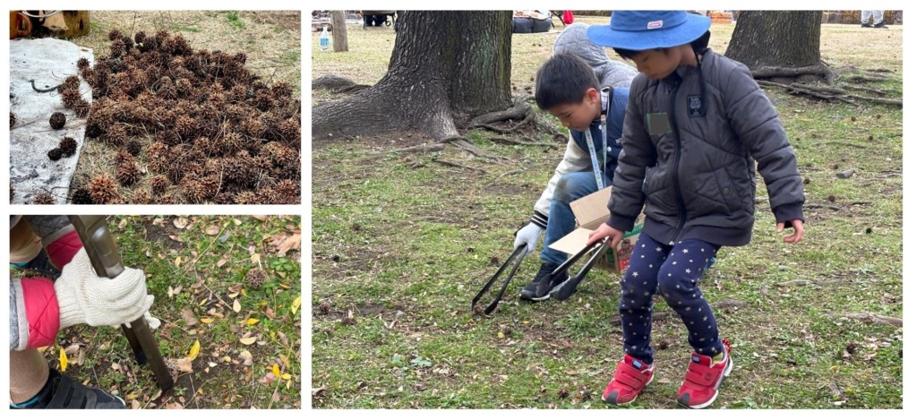 今回もっとも「焚き火」で遊んでいたのはコチラの3人組です。木の実を拾い集めに走っていく姿は、まるで宝探しに出掛けていくようで、ワクワクが溢れていました。小さな手で大きなトングを使う姿も、協力して段ボールを運ぶ姿も、本当にGOOD♪